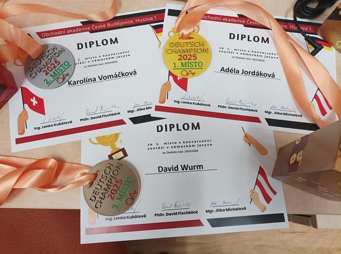 Děkujeme všem účastníkům školního kola olympiády v německém jazyce za jejich nadšení a zájem o tento jazyk. Učte se, mluvte, dále objevujte! Gratulujeme vítězům: na 1. místě se umístila Adéla Jordáková (2. C), 2. místo obsadila Karolína Vomáčková (3. AL), 3. místo patří Davidu Wurmovi (3. AL).